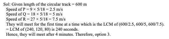 Q89. P, Q, R run in the clockwise direction around a circular track that is 600 m long, with speeds of 9 km/hr, 18 km/hr and 27 km/hr respectively. They all start from point X, simultaneously. How much time after the start will they all meet again for the first time at X?