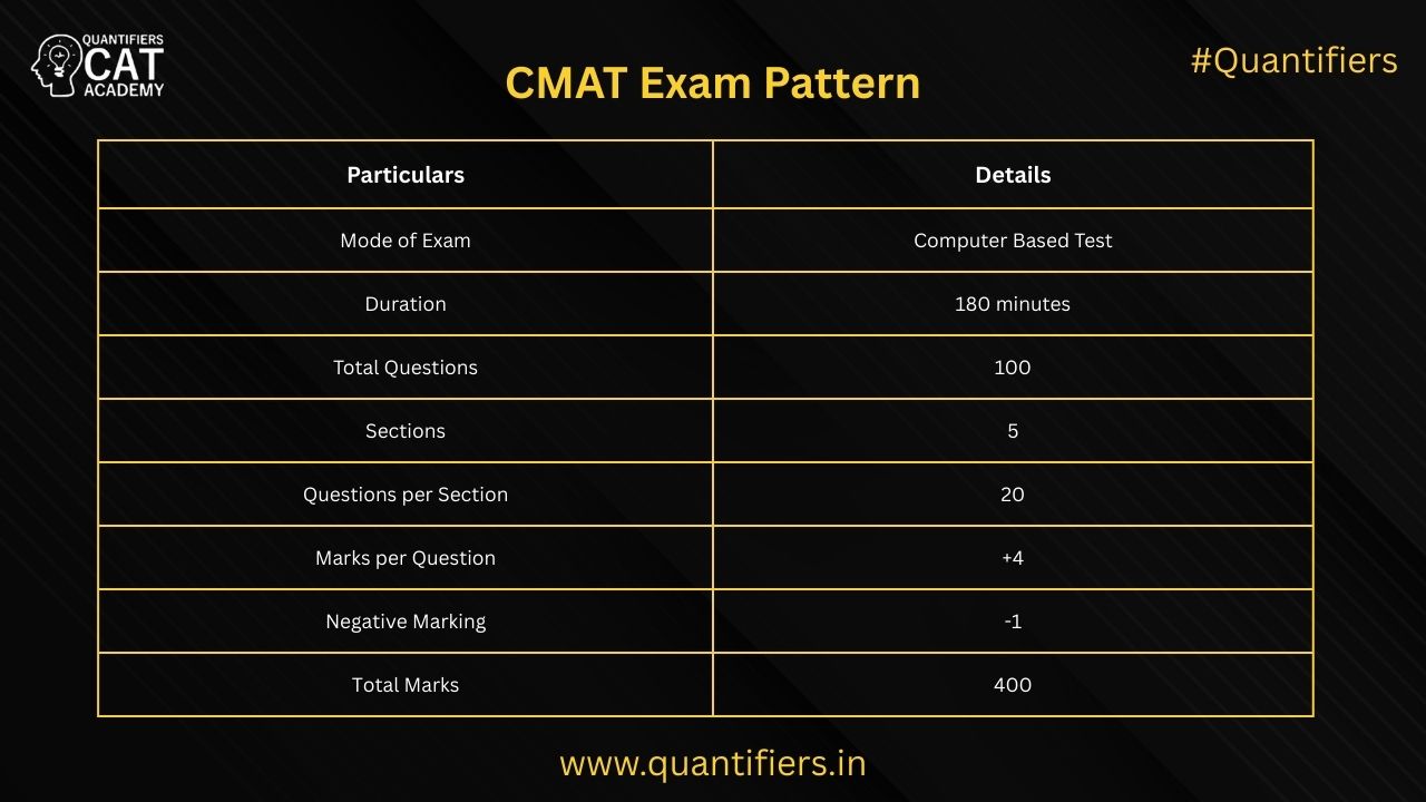 CMAT has five sections: Quantitative Techniques & DI, Logical Reasoning, Language Comprehension, General Awareness, and Innovation & Entrepreneurship.