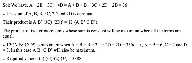 Q10. A, B, C and D are four positive numbers which satisfy the equation A + 2B + 3C + 4D = 36. Find the maximum possible value of AB2CD2.