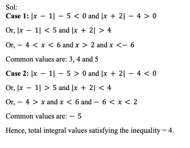 Q11. Find the number of integral solutions for the inequality (|x – 1| –5)(|x + 2| –4) < 0.