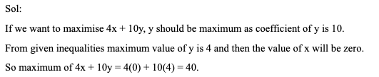 Q12. For non-negative real numbers x and y, 3x + 4y ≤ 16 and 5x + 2y ≤ 10. What is the maximum possible value of (4x + 10y)?