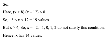 Q13. How many integral values of ‘x’, which is a real number, satisfy the equations x2 – 4x – 96 < 0 and x2 > 4?