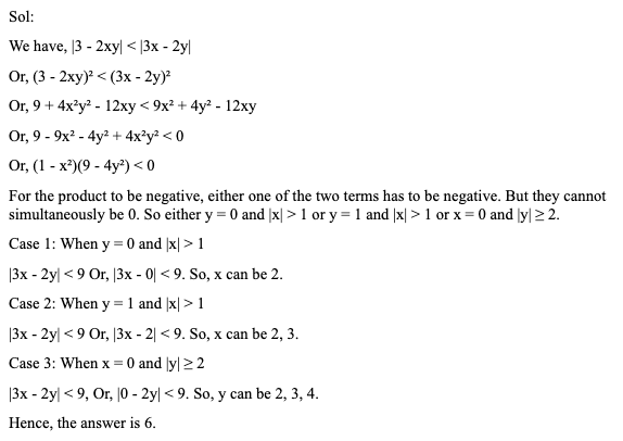Q14. Find the number of distinct pairs of non-negative integers (x, y) satisfying |3 – 2xy| < |3x – 2y| < 9.