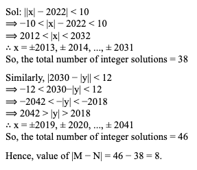 Q15. Let M and N be number of integral solutions to ||x| – 2022| < 10 and |2030 – |y|| < 12. What is the value of |M – N|?