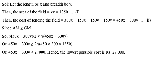Q5. A farmer wants to fence his rectangular field to protect his crops from animals. The cost of fencing the field is Rs. 300 per meter on one side, and Rs. 150 per meter along three other sides. If the area of the rectangular field is 1350 sq. m, then what is the lowest possible cost (in Rs.) of fencing the field?