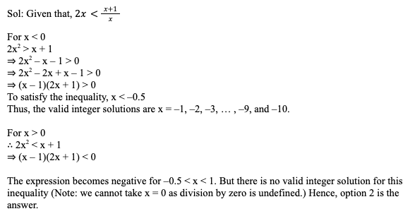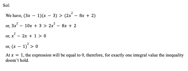 Q32. Number of integer values for which the inequality (3x – 1) (x – 3) > (2x2 – 8x + 2) does not hold true is/are: