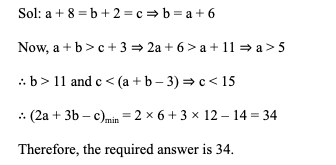 Q18. If a and b are non-negative integers such that a + 8 = c, b + 2 = c and a + b > c + 3, then the minimum possible value of (2a + 3b – c) equals: