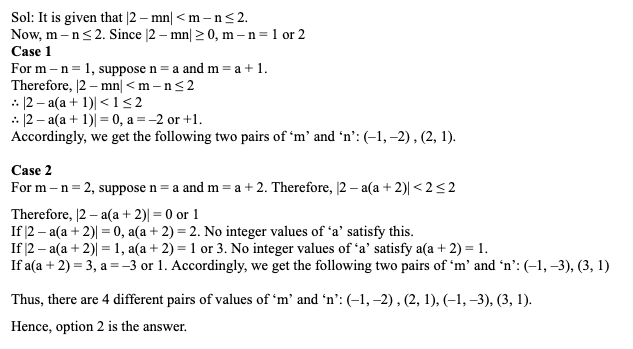 Q22. The number of distinct pairs of integers (m, n) satisfying |2 – mn| < m – n ≤ 2 is:
