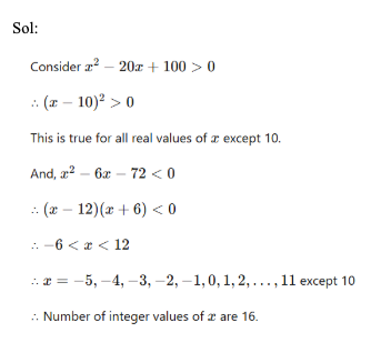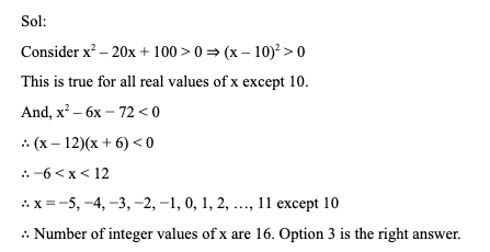 Q29. What is the number of integer values that x can take for both the inequations x2 – 6x – 72 < 0 and x2 – 20x +100 > 0?