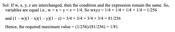 Q30. If w + x + y + z = 1, where w, x, y, z are non-negative, then the maximum value of wxyz/(1 – w) (1 – x)(1 – y)(1 – z) is: