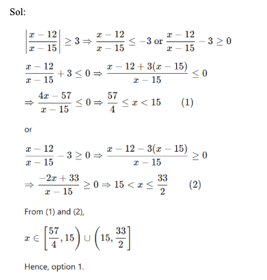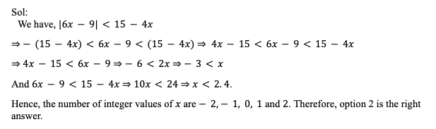Q33. The number of integral values of x satisfying the inequality |6x – 9| < 15 – 4x is: