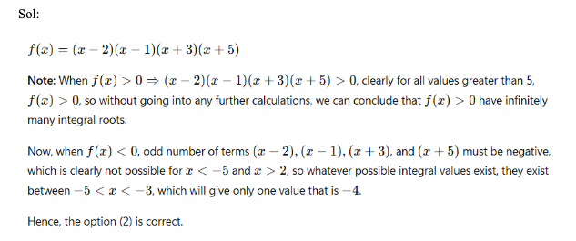 Q36. Let f(x) = (x – 2)(x – 1)(x + 3)(x + 5), then which of the following is true regarding the number of integral roots of f(x) > 0 and f(x) < 0 respectively?