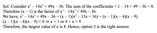 Q41. What is the highest value of ‘x’ for which x3 – 14x2 + 49x – 36 < 0?