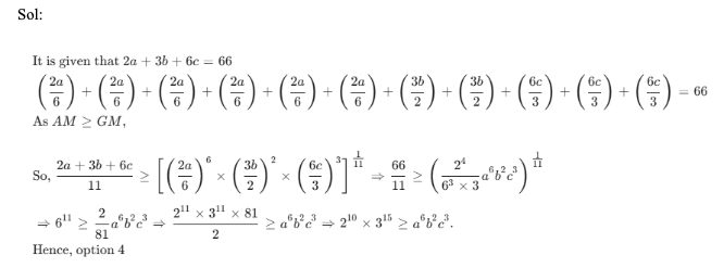 Q49. lf 2a + 3b + 6c = 66, where a, b and c are positive real numbers, then find the maximum value of a6 b2 c3.