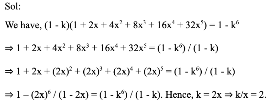 Q1. For k ≠ 1, (1 – k)(1 + 2x + 4x2 + 8x3 + 16x4 + 32x5) = 1 – k6, then what is the value of k/x?