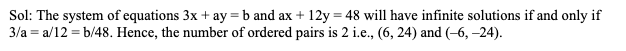 Q10. How many ordered pairs (a, b) are there for which the system of equations 3x + ay = b and ax + 12y = 48 will have infinite solutions?
