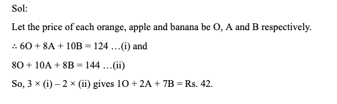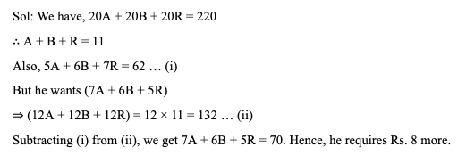 Q42. Murphy had Rs. 62 with which he could buy 5 apples, 6 bananas and 7 oranges. The cost of 20 apples, 20 bananas and 20 oranges together are Rs. 220. If he wanted to buy 7 apples, 6 bananas and 5 oranges. How much more money (in Rs.) will he require?
