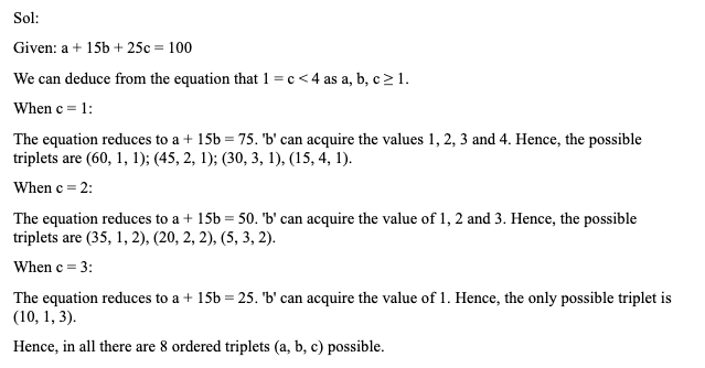 Q12. Ashish had Rs. 100 which he completely used up to buy a, b, c quantities of toffees, chocolates and packets of chips each of which cost him Re.1, Rs. 15 and Rs. 25 respectively. If he bought at least one unit of each item, the number of triplets (a, b, c) that is possible is: