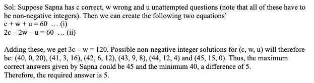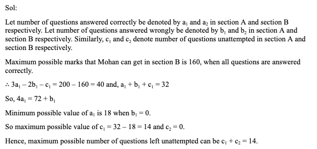 Q16. Mohan gave a test that consists of two sections A and B comprising of 32 and 40 questions respectively. For every correct answer in section A and B, Mohan is rewarded with 3 and 4 marks respectively. For every wrong answer in section A and B, 2 marks and 3 marks are deducted and for every unattempted question in section A and B, 1 mark and 0 marks are deducted respectively. If Mohan got 200 marks in the test and he got the maximum possible marks in section B, then the maximum number of questions left unattempted by him can be: