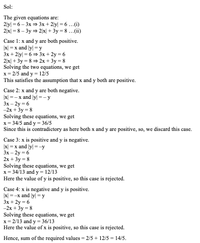 Q17. If the equations 2|y| = 6 – 3x and 2|x| = 8 – 3y, then the sum of all values of x and y is: