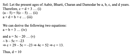 Q22. Charan and Damodar are the children of Aabir & Bharti, who are married to each other. Damodar is 3 years younger than Charan. Five years ago, Aabir was five times as old as Charan. If, at present, the average age of all of them is equal to the average age of Charan and Bharti, and Bharti was 29 when Charan was born, then, find the current age (in years) of Damodar.
