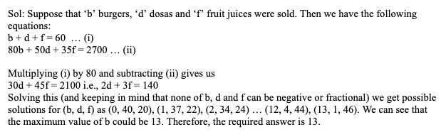 Q23. A fast-food joint sells three types of items – burgers priced at ₹ 80 each, dosas priced at ₹ 50 each and fruit juices priced at ₹ 35 each. On a particular day, exactly 60 items were sold and the total earnings from this was ₹ 2700. What could be the maximum number of burgers sold?