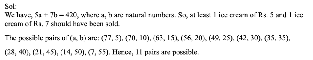 Q3. An ice cream vendor sells ice creams for Rs. 5 and Rs. 7. The vendor sold ‘a’ Rs. 5 ice creams and ‘b’ Rs. 7 Ice creams costing Rs. 420 on a Sunday evening. If ‘a’ and ‘b’ are natural numbers, then how many pairs of (a, b) are possible?