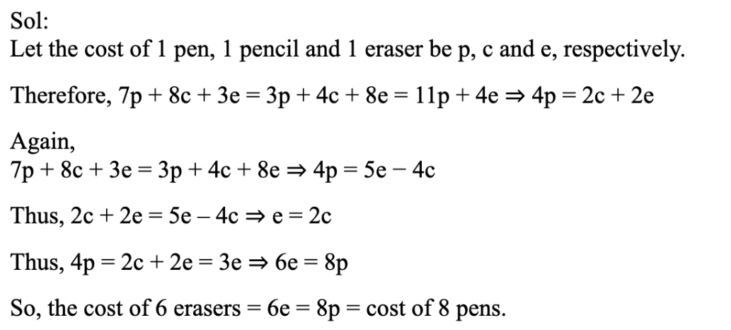Q4. Total cost of 7 pens, 8 pencils and 3 erasers is equal to the total cost of 3 pens, 4 pencils and 8 erasers, which is also equal to the total cost of 11 pens and 4 erasers. If the cost of ‘n’ pens is equal to the cost of 6 erasers, then the value of ‘n’ is: