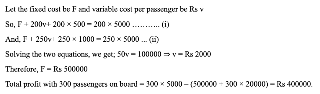 Q5. One-way air ticket of FlyGo airlines from Kolkata to Mumbai costs Rs 5000. One part of the operating expenses of the airlines is fixed and the other part is proportional to the number of passengers on board. When the number of passengers is 200, the profit of the airlines is Rs 500 per passenger; and when the number of passengers is 250, the profit of the airlines is Rs 1000 per passenger. The total profit of the airlines, in INR, when the number of passengers is 300, will be: