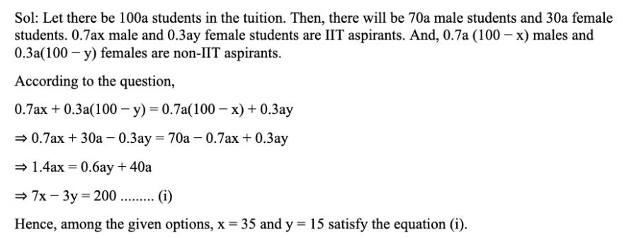 Q7. In a tuition, 70% of the students are male and x% of the male students and y% of the female students are IIT aspirants. The total number of IIT aspirants who are male and non-IIT aspirants who are female is equal to the total number of non-IIT aspirants who are male and IIT aspirants who are female. Which of the following could be the possible value of (x, y)?
