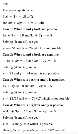 Q8. If 4|x| + 3y = 18 and 3x + 2|y| + 5 = 0, then 6x – 5y is: