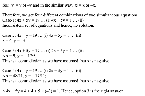 Q25. If 4x + 3|y| + 2y = 19 and 3x + |x| + 5y = 1, then 4x + 5y is: