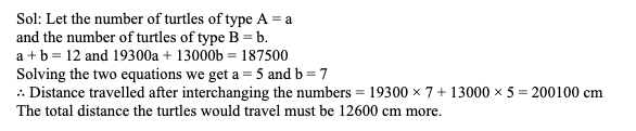 Q27. A total of 12 turtles were tracked in a project of tracking the movement of turtles at Marina beach in Chennai. There were two types of turtles- Turtle A and Turtle B. Each turtle of type A covered 19300 cm, while each turtle of type B covered 13000 cm. The sum of the distances covered by the 12 turtles was 187500 cm. If the numbers of turtles of type A and type B were interchanged, how much more/less would have been the sum of the distances covered by the 12 turtles?