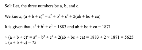 Q28. The sum of squares of three positive numbers is 1883 and the sum of products of all possible combinations of these three numbers taken two at a time is 1871. What is the sum of these three numbers?