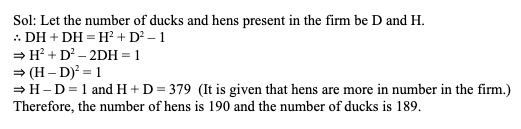 Q29. A poultry farm has only two types of birds – hens and ducks. If we multiply the number of hens with the number of ducks and add it to the number derived by multiplying the number of ducks with the number of hens, the summation will be one less than the number derived by adding number of hens multiplied by the number of hens and number of ducks multiplied by the number of ducks. The farm has a total of 379 birds. How many ducks are there in the farm if it is known that the number of hens is more than the number of ducks?