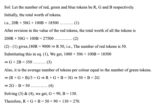 Q31. In a casino, there were three different coloured tokens — Red, Green and Blue — with face values of Rs.20, Rs.50 and Rs. 100 respectively. The total worth of all the tokens in the casino was Rs. 18,500. On a busy day, when the tokens were not sufficient, all the Red tokens were given a new face value of Rs.200 (while there was no change in the value of the Green and Blue tokens). The net worth of all the tokens after the change was Rs. 27,500. If the average number of tokens per colour is equal to the number of Green tokens, then find the total number of tokens in the casino.