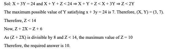 Q33. X, Y and Z are distinct natural numbers. If (Z + 2X) is divisible by 8, find the maximum possible value of Z for which X + 3Y = 24 and X + Y + Z < 24.