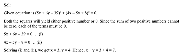 Q34. If (5x + 6y – 39)2 + (4x – 5y + 8)2 = 0, then the value of x + y is: