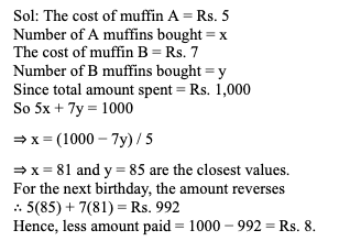 Q35. Rekha bought two types of muffins – A and B in x and y quantity worth Rs. 1,000 for her daughter’s birthday party such that each muffin costs Rs. 5 and Rs. 7 respectively. x and y are as close as possible. On her next birthday, Rekha buys muffins – A and B in y and x quantity respectively. How much (in Rs.) more/less did Rekha pay? (Assume that the price of the muffins is same in both the years)