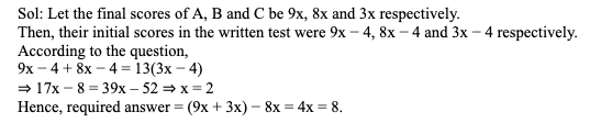 Q36. In a written test of Mathematics, the score of C was one-thirteenth of the sum of the scores of A and B. After an oral test, each of them’s scores increased by 4. If the final scores of A, B and C were in the ratio 9: 8: 3, then the final score of B was how much less than the sum of the final scores of A and C?