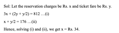 Q37. The railway ticket for a child cost half the full ticket but the reservation charges are the same for half as well as full ticket. Mr. and Mrs. Kanwar along with their 7 years old son purchased three tickets for a journey between two stations and paid a total of Rs.812. If the total cost of the ticket for the child alone is Rs.176, then what are the reservation charges per ticket (in Rs.)?