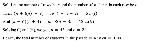 Q38. In a school, students are made to stand in rows in the Independence Day Parade. If there are 6 additional students in a row, then there would be 3 rows less. If there are 6 students less in a row, there would be 4 rows more. The total number of students in the parade is: