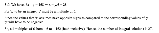 Q39. How many integral solutions exist for the equation 6x – y = 168, such that the values that ‘x’ assumes have opposite signs as compared to the corresponding values of ‘y’?