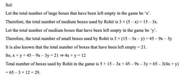 Q40. Rohit has three types of boxes large, medium and small. He played a game in which he placed 5 large boxes on the table. He puts 3 medium boxes each, in a few of the large boxes then he puts 3 small boxes each, in a few of the medium boxes. If the number of boxes that have been left empty in the game is 21, then how many boxes were used in the game by Rohit?
