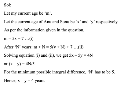 Q41. My current age is 7 years, more than five times the age of one of my two daughters named Anu. After N years, I will be 7 years more than five times the age of my other daughter named Sonu. What is the minimum possible integral difference (in years) between the ages of my two daughters? (N is a natural number.)