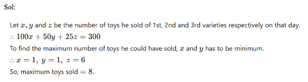 Q46. On a particular day, a salesman sold 3 types of toys. Each toy of the 3 varieties sells at Rs. 100, Rs. 50 and Rs. 25 respectively. If the total sales on that day were of Rs. 300 and that salesman sold at least one toy of each variety, then find the maximum number of toys he could have sold on that day.