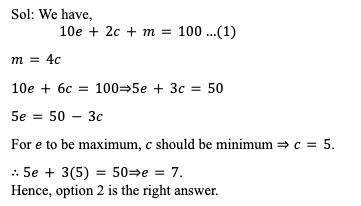 Q48. A factory makes 3 flavours of candies – eclairs, caramel and mint – and sells at Rs. 10, Rs. 2 and Re. 1 per candy respectively. Karan bought candies for Rs. 100 with at least one candy of each flavour, in which the number of mint candies was 4 times that of caramel candies. Find the maximum number of eclairs candies bought by him?