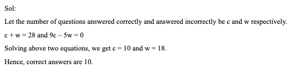 Q50. In a test, consisting of 28 questions, 5 points are deducted for each incorrect answer, 2 points are deducted for each unanswered question and 9 points are awarded for each correct answer. Jaskaran writes the test and obtains a final score of 0. If Jaskaran answered all the questions, how many questions did he answer correctly?