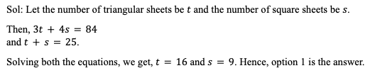 Q51. A box contains a collection of triangular and square paper sheets. There are 25 sheets in the box having 84 sides in total. How many square paper sheets are there in the box?