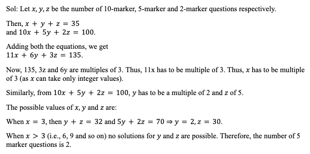 Q52. The total number of multiple-choice questions in a paper is 35. It comprises 10 marker, 5 marker and 2 marker questions. The maximum marks that a student can secure in this paper is 100. Find the number of 5 marker questions in the paper.